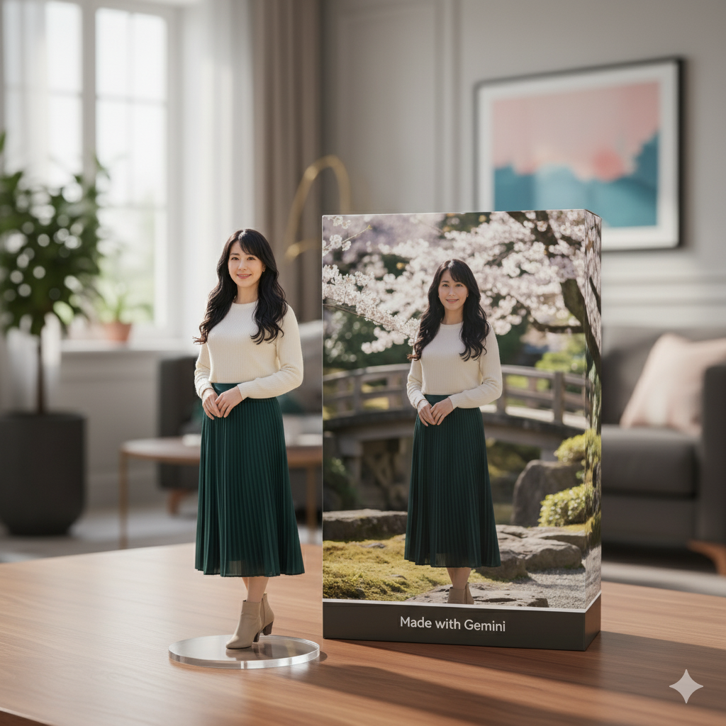 写真のキャラクターを、リアルなスタイルと環境で1/7スケールの商品化フィギュアの画像を作成してください。フィギュアは、テキストなしの円形透明アクリルベースを使用して、机の上に置いてください。そのフィギュアの横に、元の作品が印刷された立体的なおもちゃのパッケージボックスを置いて、ボックスの下の方には「Made with Gemini」とだけ書かれている。背景にはお洒落なリビングが見える。
