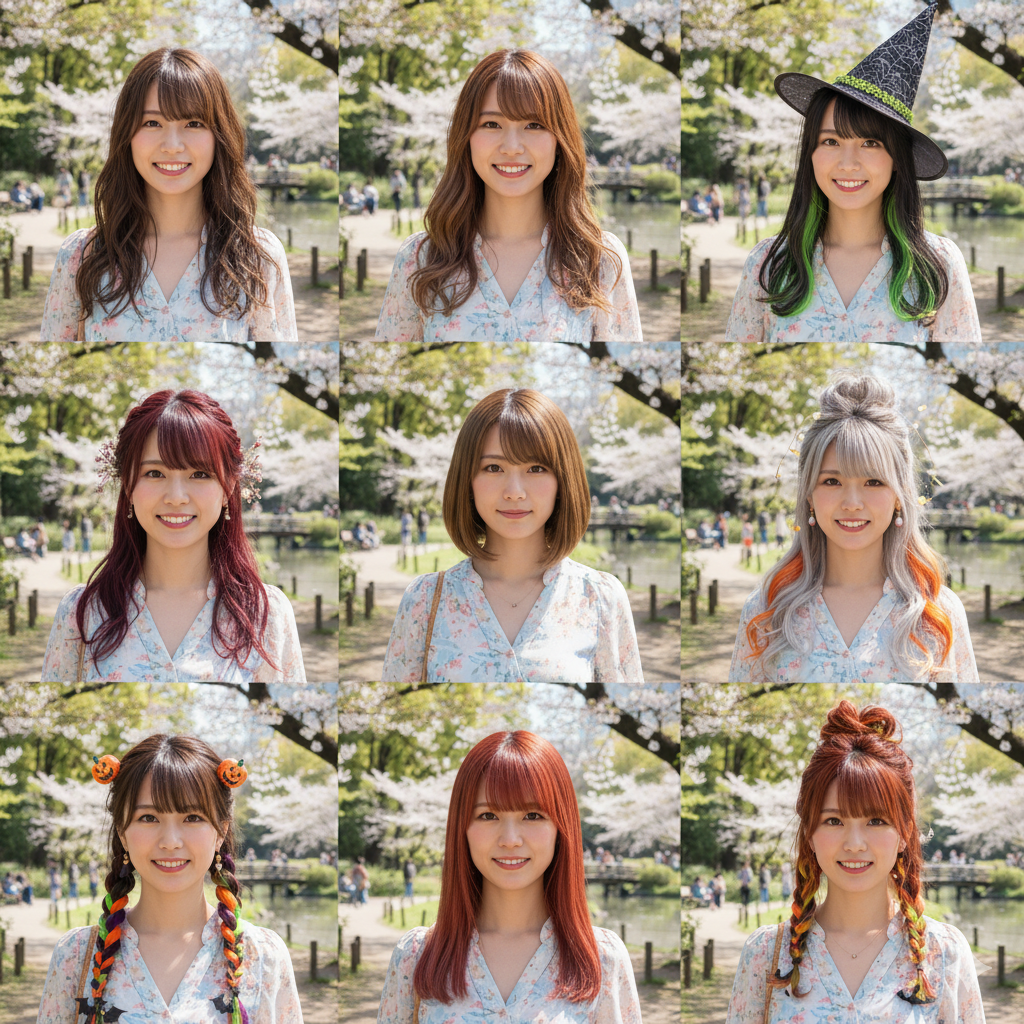 グリッド内の3枚は画像の人物に似合う髪型、3枚は秋にトレンドのカラーや髪型、3枚をハロウィンをテーマにした派手なヘアスタイルで、それぞれ正方形の画像で生成してください。 ハロウィンをテーマにした髪色は、オレンジ、パープル、黄色、黒、ネオングリーンなどを組み合わせた奇抜なカラーリングにしてください。 髪型はお任せしますが、魔女、ゴースト、パンプキンなどハロウィンを彷彿とさせる、ユニークで創造的なスタイルを希望します。派手な髪型と通常の髪型をランダムに配置して下さい。
