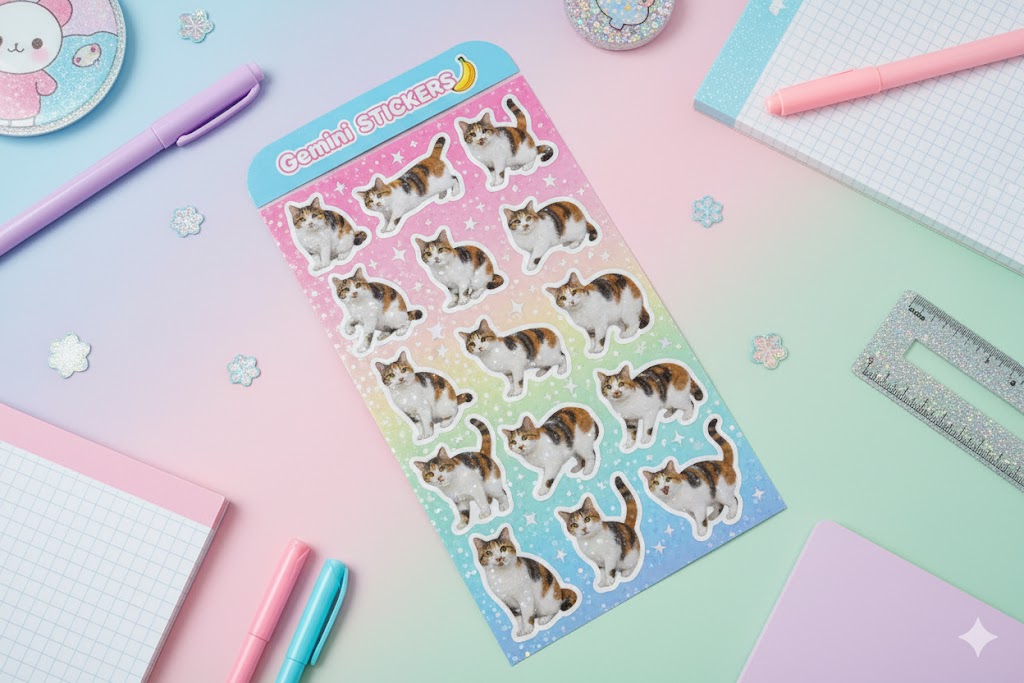 90年代から2000年代初頭の日本の「平成レトロ」ポップカルチャーのノスタルジックなスタイルで、この動物を様々なポーズ、表情、行動をリアルな写真スタイル、インパクトがあり目を引くかわいいテーマの写真のステッカーシートの画像を生成します。イラストではなく、リアルな写真のステッカーシート。丸い上部カットと、丸みを帯びたかわいいポップフォントで「Gemini STICKERS🍌」と書かれたラベルが付いた1枚の細長いシートです。シートには、ページから飛び出すような立体的でふわふわした写真ステッカーが20枚以上入っており、キラキラと輝くホログラフィック、プリズムのディテールが特徴です。各ステッカーはリアルでキュートで様式化された感触で、白い枠でダイカットされています。シート全体は、キラキラと星で飾られた楽しい雰囲気の鮮やかなパステルグラデーションの背景で統一されています。リアルな写真スタイルで、ダイナミックな構図です。背景には、机の上に並べられたスタイリッシュなパステルカラーの文房具が描かれています。